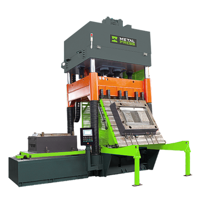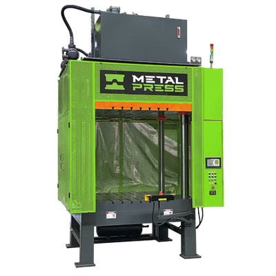 MetalPress Machinery offers the MPTP Series of hydraulic 4 post trim presses designed for efficiency in manufacturing processes. Built with high-quality components, these presses provide significant return on investment. They incorporate advanced PLC control systems with large HMI screens for intuitive management of parameters, enhancing operational efficiency. Optional features include hydraulic ejection, digital position sensors, safety light curtains, and automated lubrication systems to minimize maintenance. The presses are flexible, adapting to various applications with available configurations from 35 to 200 tons. Integration options include a robot interface and remote connectivity units offer Industry 4.0 monitoring capabilities. Safety is prioritized with features such as zero-force touch buttons and pneumatic safety doors. The modular design includes core punches and automated parts unloading, further streamlining production.MetalPress - Model MHS Series - Servo Hydraulic Press