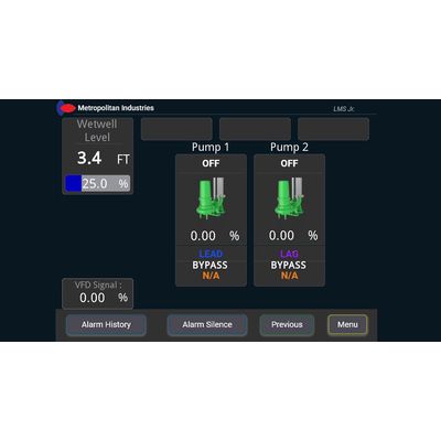 The LMS Jr. is a complete menu-configurable level management system that provides cloud SCADA control for commercial lift stations, in addition to large residential or small municipal applications. The system comes equipped with a color touch screen with setpoint adjustment, trends, and built-in help buttons which allows users easy interaction with their control system. The LMS JR has several failover options available such as redundant transducer and 4 float backup which can all be enabled at once to give users peace of mind their system will keep pumping. The flow estimation feature uses an algorithm which can calculate influent, effluent, and per pump flow rates along with flow totalizers for constant speed applications.
