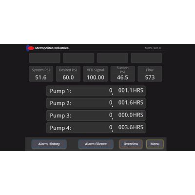 The MetroTech III Pro is complete menu-configurable pressure management system providing municipal booster pump cloud SCADA control capability. The system comes equipped with a color touch screen with setpoint adjustment, trends, and built-in help buttons which allows users easy interaction with their control system. The MetroTech III Pro has several failover options such as redundant pressure transducers, low suction detection, and safe start feature all geared towards keeping the system working. The MetroTech III Pro can be paired up with a number of devices to provide alarm notification such as phone dialers, MetroMail, dry contacts, etc. To make matters even easier, every MetroTech3 Pro comes MetroCloud ready making world class municipal booster pump cloud SCADA control functionality available for a low monthly fee. For commercial or light municipal pressure level management, we recommend the MetroTech III.