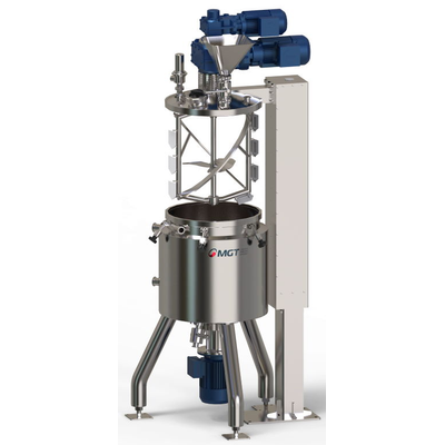 The vessel is designed for high viscosity and semi-solids products with a special agitator configuration that ensures smooth and homogeneous products to improve production time. The vessel is equipped with a top double motion counter-rotating agitator, bottom-mounted high shear homogenizer, and bottom disperser disc to insure excellent homogenization and powder impregnation in the liquid phase.