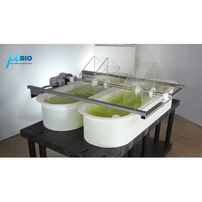 Small 0.5 m2 raceways intended for inoculation culture development or programs just getting starting in algae research. Stands are elevated to allow for easy gravity draining to downstream processes. This smaller design allows you to operate more raceways efficiently and enables duplicate and triplicate experiments.