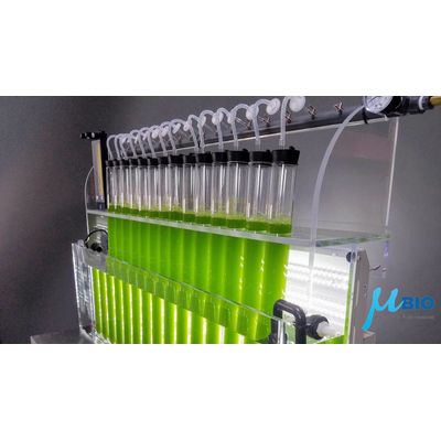 The MBE Bubble Column Array PBR features fourteen 800 mL glass column reactors, allowing for multiple simultaneous experimental conditions. The simplicity of the design allows for manageable operations and the large volumes allow for dry weight measurements. The energy efficient LED has a maximum light intensity of 1,600 μmol/m²-s, dispersed evenly across the width of the array for reproducible experiments. An integrated temperature controlled water bath allows for a wide range of culture temperatures (8-34°C).
