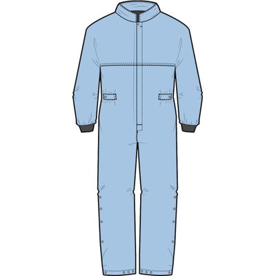 Elasticated cuff carries a grounding stud; Cuff, Body and Sleeves constructed with integrated conductive tape that runs from the grounding stud at the cuff, along underarms and down to mid-calf on both legs; Front and back yoke seams constructed with integrated conductive tape which connects with the conductive tape at the sides; Stand Collar; Magyar sleeves; No Pockets; Stainless Steel Stud adjustments at waist and knee; All panel edges are heat-sealed.