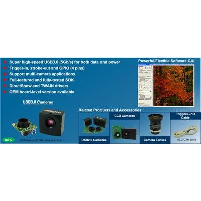 Mightex’s ultrafast USB 3.0 cameras are designed for applications that require high-speed and/or multiple cameras. These cameras are equipped with a super-speed USB3.0 interface that can deliver a transfer rate of up to 400 Mbytes per second, which is 10 times the USB2.0 speed, 3.5 times GigE speed and 6 times Firewire-800 speed. With a fast and high-definition Aptina 5 Megapixel CMOS image sensor that can offer up to 14fps in full resolution and up to 350fps using ROI mode, Mightex USB3.0 cameras are suited for industrial applications that require a great amount of data to be processed and transferred from the camera to the PC. These ultra-compact cameras have external trigger-in, strobe-out, and a powerful engine that supports multiple camera operations. In addition to all these outstanding features, a user-friendly GUI based application software and an SDK are provided for custom software development.