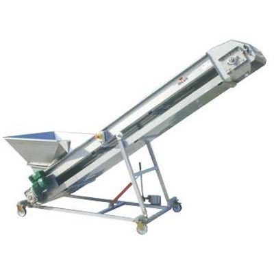 Elevator/Conveyor belt custom-designed and custom built from a superior shaped structure. It is made from Aisi 304 stainless steel sheet with side slits allowing for internal washing between the belts. The inner side of the belt rests on a shaped surface, making it easier for it to move along. The drive roller is covered in rubber allowing for better traction on the belt. An easy-to-wash tray is positioned below the structure to collect the liquid produced. Scrapers clean the inside of the belt. Top brand drive unit.