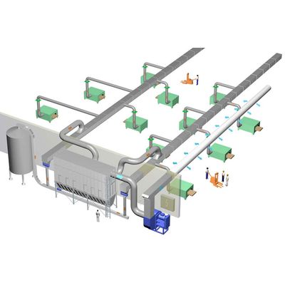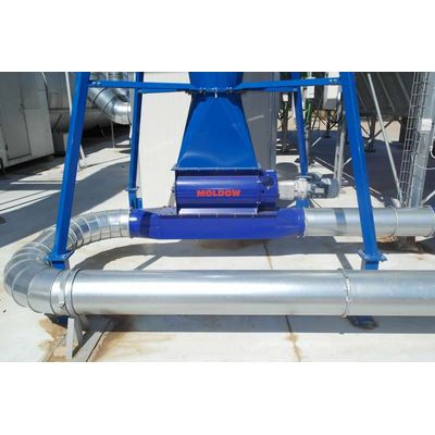Moldow has installed a large number of extraction systems which utilize dilute pneumatic conveying principles. A Dilute Pneumatic conveyor is established using traditional round ducting and fans. The system can be used to transport waste from the filter unit to a silo or container. Since the system uses air to transport waste, there are limits to the amount of waste which can be transported. Typically the system is used to transport light to moderate amounts of waste. Dilute pneumatic conveyors are very easy and cost effective to establish when compared to Chain Conveyor systems, however they are far less energy efficient.