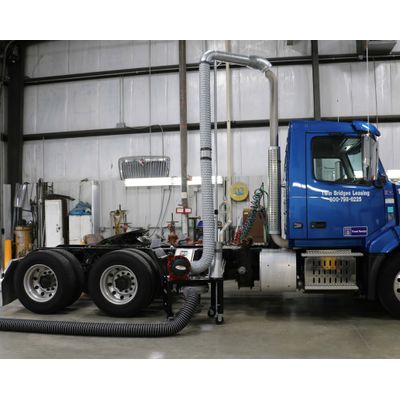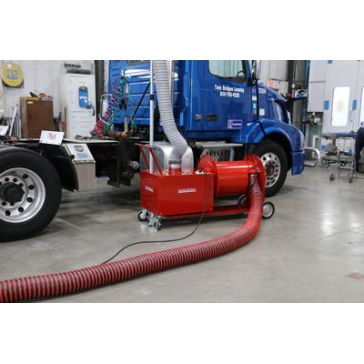 The Portable Fume ELIMINATOR was developed for use in shops where a conventional overhead or under-floor exhaust system is not practical. It is ideal for truck, bus, agricultural and construction equipment applications that require fume extraction.The ELIMINATOR is a compact, self-contained portable exhaust system. The compact base with a footprint of 20” x 28” makes storing the Portable Fume ELIMINATOR easy. Depending on the model, the vertical mast has a stored height of 90” or 120”. The adjustable mast can be easily raised or lowered to fit all top and mid-body exhaust pipes. For under chassis, simply uncouple the hose on the vertical mast and couple it to an under chassis clamping nozzle. For truck applications, the main vertical stack features a 45-degree end with an 8” opening.