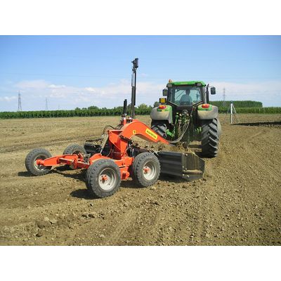Towed graders type ROMA 700 for horse power tractors from 350 to 600 HP also tracked or articulated, built with patented frame and calculated up to 700 HP. Towed grader arranged to be controlled by LASER or GPS system with broken-line gooseneck bin chassis.