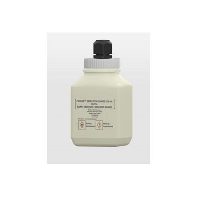 FIXOR MP™ DEMOLITION CHARGE (250 ML) is comprised of one deployable plastic bottle containing FIXOR MP™ Part A (Class 3 flammable liquid) and another bottle that contains FIXOR MP™ Part B (Class 8 corrosive liquid). When the Part B is added to the bottle of Part A, 0.307 kg (0.68 lb.) of FIXOR MP™ Binary Explosive (Class 1.1D explosive, UN0048) is instantly formed inside the deployable bottle. A fully adjustable Detonator Adapter is provided to securely hold a detonator in place (detonator not included).