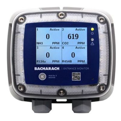 Entrance monitor for improving safety in commercial and industrial applications. The MSA Bacharach MGS-401 Entrance Monitor centralizes the status of up to four (4) MSA Bacharach diffusion Gas Detectors, which in turn provides an audible and visual alarm outside a monitored space. In addition, the MGS-401 displays any gas concentration level in the space for additional information and visual monitoring. System configuration will determine whether the alarm signals are addressed in the monitored space or at a controller or BMS/BAS level.