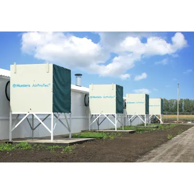 Reduce emissions of dust and ammonia from the exhaust air of poultry and pig stables with the Munters Lavamatic drum washer. For pig stables odor reduction with an additional bio stage is possible. This complete, prefabricated module is available in 2 sizes 50.000 and 100.000 m3/h and helps livestock farmers to comply with environmental regulations.
