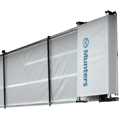 Munters Folding Curtain provides a natural wall inlet for cross ventilation and ventilation driven by the vertical chimney effect. MFP is made of a light-grey semi-transparent, hardy, UV-resistant fabric. The light-grey color is specifically chosen to ensure optimal natural light penetration of the fabric. To prevent draft, the bottom of the curtain is fixated to the top of the wall. The top of the curtain is suspended in a corrosion-resistant wire system, which can be operated vertically either manually or automated. By each end of the curtain, there are wind traps that ensure little or no draft at both ends. Furthermore, vertical braces are installed between the top and bottom of the wall opening with horizontal intervals of a maximum of 2 m. The height interval within which the Folding Curtain is supplied is from 1 m up to 3 m.