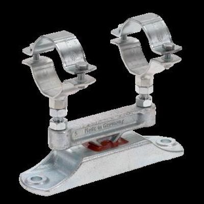 Field of application: The ideal component for vibration controlled anchor points for pipes to meet the vibration control requirements of DIN 4109 and VDI 4100, Variety of installation possibilities (floor-mount, ceiling-mount, wallmount, rail-mount, cross stay), Floor mounting of pipe and duct lines, Ideal as vibration-isolated pipeline anchor point for downpipe support or riser pipes. Advantages: Acoustically decouples the pipe from the building structure and reduces the structure-borne noise by up to 40 dB, Practical design facilitates installation, Practical construction for a 2-point fastening of the pipe, Special feature: Also approved for alternating load directions on plastic piping, Continuously adjustable distance from the wall, Silicone-free