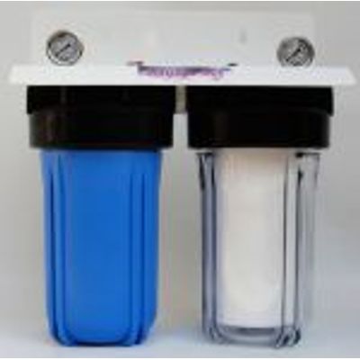 FBBC-210 is a twin Big-Blue type filter that is placed at the inlet of the central water supply and is constituted of: Two Big-Blue filters, Two pressure gauges (manometers), one metal base. The containers of the two filters are manufactured of food PVC. The first is clear and the second is blue. The clear container is at the water inlet and contains a 10` cartridge for suspensions, while the blue container contains a 10` cartridge of activated carbon. The two manometers show the water pressure before and after the filters. The metal base is dyed white with electrostatic dye. The inlet and the outlet supply is 3/4`.