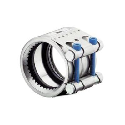 NORMA CONNECT GRIP/GRIP E axial restraint pipe couplings are used to connect metal pipes. The anchoring ring with conically stamped teeth indents into the pipe surface (steel, stainless steel or cast iron) and provides safe and strong axial restraint. Owing to the special design, the coupling can withstand even high vibration loads.