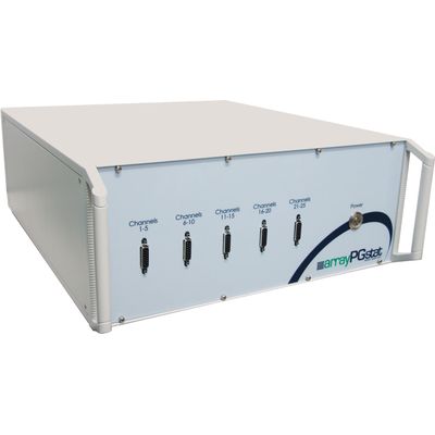 The ArrayStat Multichannel Potentiostat is a sophisticated piece of electrochemical testing equipment designed for combinatorial chemistry applications. It features 25 channels that share a common counter electrode configuration, allowing synchronized electrochemical measurements across multiple samples. The system is available in three current range versions—ultra low-current (ULC), low-current (LC), and high-current (HC)—to accommodate diverse experimental setups. This flexibility ensures precise control and measurement of currents across a wide range of electrochemical processes. As part of NuVant Products, the ArrayStat is supported by a suite of accessories and specification documentation, making it a versatile tool for hybrid battery diagnostics, HEV/EV research, and other electrochemical studies. Its deployment in research and industry underscores its utility in advanced electrochemical technology.