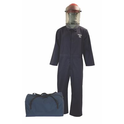 Oberon Arc Flash Clothing Set - FR Treated Cotton (CAT) Series - HRC2 (8+ cal) - Contains (1) Arc Flash Faceshield with Hard Cap (21ARC8AF-C+500), (1) CAT2 Arc Flash Coverall & (1) FRT Cotton Sock Hood (CAT11-BH-GR). Rubber Insulating Gloves and Storage Bags sold separately.