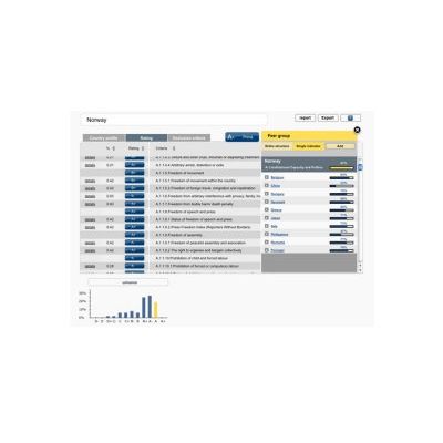 The ORBIT Countries online database provides direct access to the detailed information contained in oekom’s country ratings of 56 states plus the EU, which are analysed on the basis of around 100 social and environmental criteria. It covers all EU, OECD and BRIC countries, as well as the most important Asian and South American countries ORBIT Countries enables direct comparison of countries’ sustainability performance at all levels of the rating. Countries can be arranged in comparison groups to suit individual requirements. ORBIT Countries provides sustainable investors with new options for analysing the opportunities and risks presented by particular countries. Comparing countries’ sustainability performance makes it possible to identify shortcomings which could have an adverse impact on countries’ ability to meet their obligations arising from the issuing of government bonds.