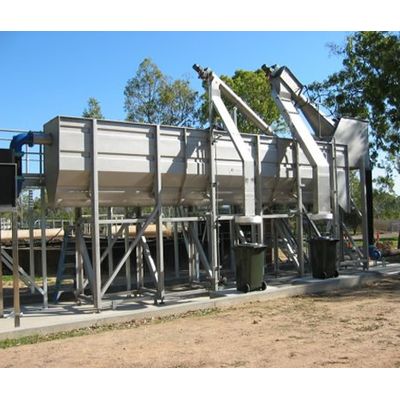 Replaces the entire headworks of the WWTP with screening, grit/sand and FOG removal. The OR-TEC Headworks combines two (or three machines) in one. Fitted directly at the inlet of the WWTP this unit completely pre-treats the plant influent. The unit first screens, washes and compacts the influent wastestream. It can be provided with 2mm - 6mm perforations (or 0.25 - 2mm wedgewire for industrial wastes). The screened wastestream is then treated for removal of grit & sand down to 200 microns (.007"). The grit is elevated and can be washed prior to disposal. The unit can also be provided with an optional oil and grease (FOG) removal system which uses compressed air to aid with flotation and skimmers to remove the oil and grease for collection and disposal.