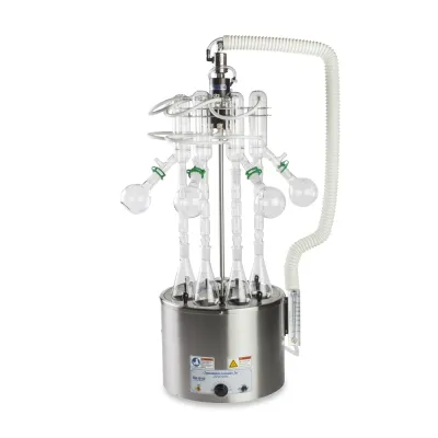 The digitally controlled 10 position S-EVAP-KD (Cat# 12010) large scale evaporator can evaporate up to 10 samples at once with a capacity of up to 250 mL at each sample position. Glassware sets can be purchased for individual solvent collection (Cat# GS2152), or central solvent collection (Cat# GS2152-C with Cat# GS2158-C10).