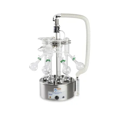 The mechanical thermostat 8 position S-EVAP-RB large scale solvent evaporator (Cat# 12060) can evaporate up to 8 samples at once with a capacity of up to 250 ml (Cat# GS2162) at each sample position. Smaller glassware accommodating up to 125 ml (Cat# GS2161) may also be used with the purchase of adapter rings (Cat# XA2286).