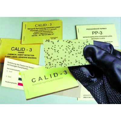 Detection papers containing 3 different dyes. They react only to liquid (concentrated) CWA groups G, H and V. Depending on the type of substance, the red, yellow, or greenish red color is occurs within a few seconds. This is in the form of tickets with pickup cards, most often as self-adhesive papers.
