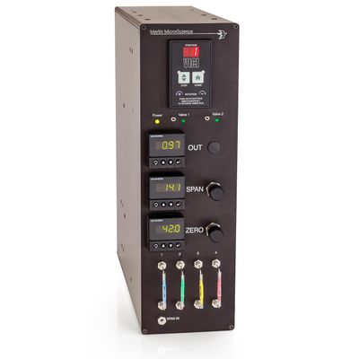 The Merlin MicroScience Dilution System (MMDS) is a gas blending system and a major enhancement to the automated VOC analyzer. It includes hardware to generate humidified air utilizing air from the existing air purifier and compressor which is required for the precursor system. This humidified air is used to generate daily system blanks and the calibration standard blend for introduction into the TD system. Calibration samples are generated by dilution of static span gases of 30 ppbv to 1 ppmv concentrations with humidified air using a micro gas blender. This dilution system is capable of blend ratios of as much as 1:10,000. It is a low volume blend apparatus with a clearing time of less than five minutes and all wetted parts are constructed of stainless steel.