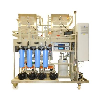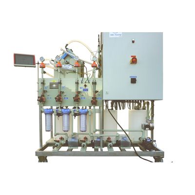 Compact pilot system to operate one electrodialysis cell with a typical total active membrane area of 20 square meters. Can be customised from 5 to 40 square meters. This allows performing automated cycles with the PC Frontend as well as batch desalinations.