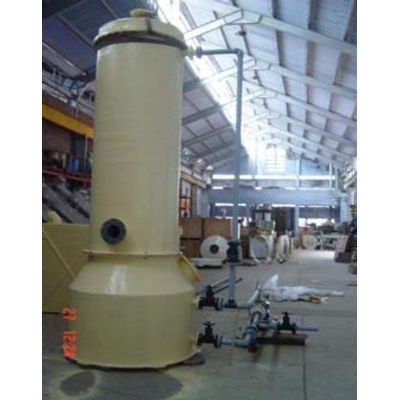 The moment the Chlorine leak is detected by any of the sensors, the blower would start automatically sucking the Chlorine air mixture through the hood on leaking ton container and only air through the other hoods on the non-leaking ton containers or through the ducting laid in Chlorine Ton Container room. Simultaneously the caustic re-circulation pump would start working, taking the caustic solution from the tank and pumping it to the top of the tower. This caustic solution gets sprayed through the nozzles in the tower over the PP pall rings. The gas air mixture travels in the tower from bottom towards the top whereas the caustic solution travels from top towards the bottom. Hence with this counter current travel, the Chlorine gas gets neutralized by the caustic solution as the packed portion provides the required contact tank. The air discharging at the blower outlet is practically free of Chlorine gas.