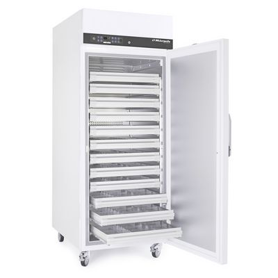 This blood bank fridge features 5 vertically adjustable drawers made of aluminium as standard. A set with 4 adjustable longitudinal and 25 adjustable cross dividers for each drawer is optionally available.