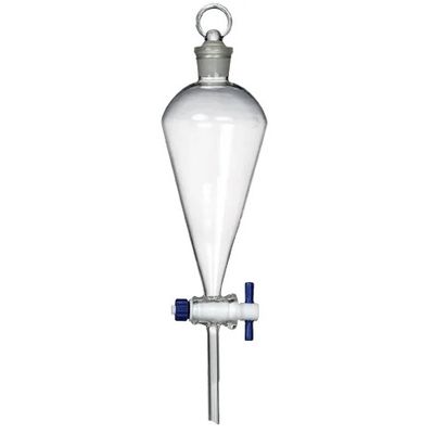 Squibb style separatory funnel with a PTFE stopcock. Supplied complete with a PTFE plug & a stopper. Separatory Funnel Including Teflon Stopcock (size 4) & Glass Stopper (size #27).
