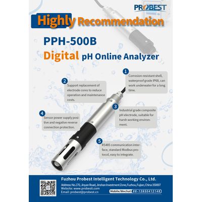 PPH-500B is a digital PH sensor using RS485 communication interface and standard Modbus protocol. It adopts stainless steel corrosion-resistant casing, IP68 protection grade, built-in PT1000 temperature-sensitive resistor and compensation algorithm, which has the advantages of high precision, long life, and small drift, and is suitable for various harsh working environments. Typical Application Surface water, waterworks, aquaculture Municipal sewage, industrial wastewater, sewage treatment, industrial process