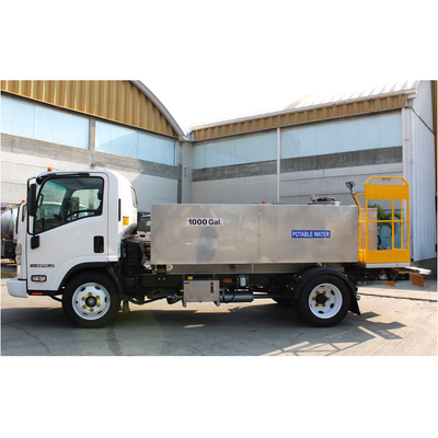 CHASSIS: Built on Isuzu NPR HD 4×2 chassis (Ford F series optional). FEATURES: The potable water truck options include gas engine, automatic transmission with diesel engine optional, fire suppression system, 1,000 Gallon (3,785 Liter) tank constructed from 316 SS, cold weather package, hydraulically driven 2″ pacer pump, Fillrite mechanical meter and register with digital meter optional, fixed platform with hydraulic platform for widebody servicing optional and fill hose.
