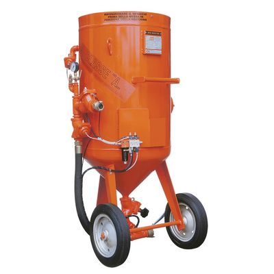 Sandblasting machine equipped with pneumatic remote control, with CE marking relative to Machinery Directive 2006/42/EC, having a tank with a capacity of 24 litres built and tested - in accordance with the current European standard 2014/68/EU (PED) with our Certification No. 1131 - at a design pressure of 8.4 bar at the Protech factory.