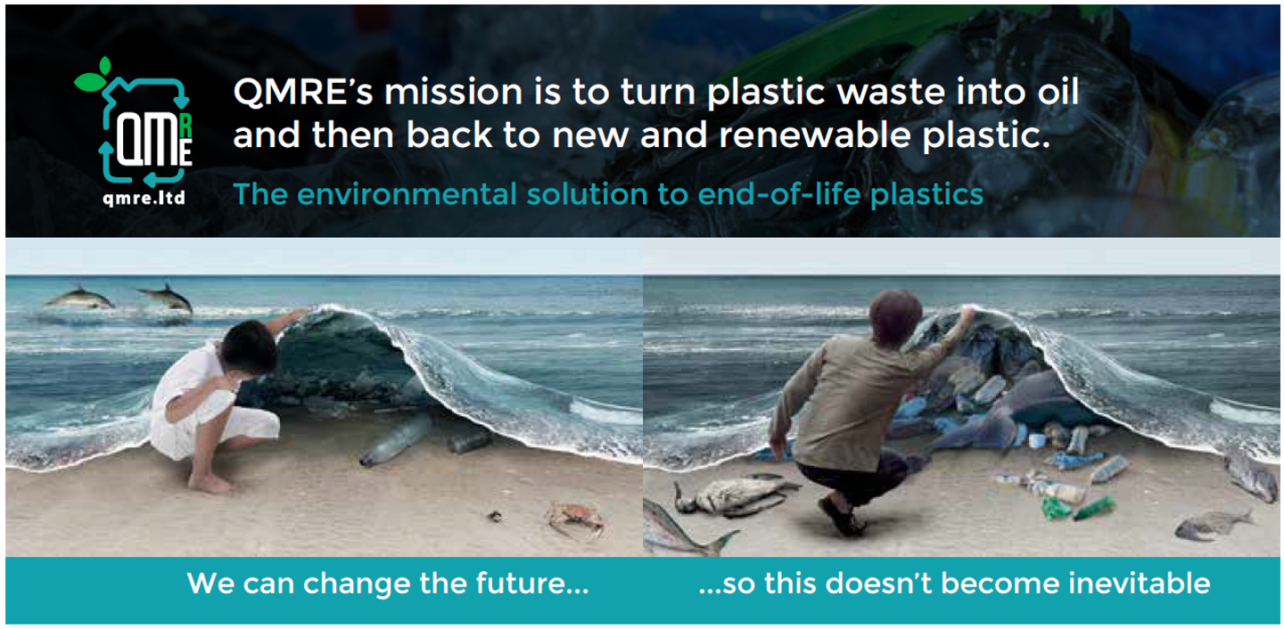 QM Recycled Energy (QMRE) has an effective, efficient solution using tried and tested – but little utilised – technology that will help reduce the effects of plastic pollution waste at the same time as providing lucrative investment and new business opportunities. Using the proven technology of pyrolysis, QMRE will take the mountains of plastic waste and return it to its natural state – oil. This will be further processed turning it into new and almost infinitely renewable plastic thereby reducing the requirement for virgin plastics from fossil fuels. This low cost and environmentally responsible solution will bring great opportunities and benefits to the entire chain involved in producing and recycling plastic from manufacturers, local authorities and the waste and recycling industries themselves.