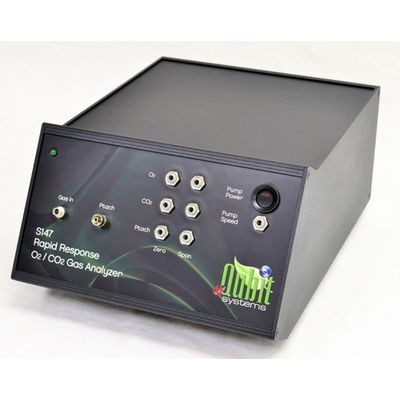 The S147 Rapid Response O2/CO2 Analyzer combines both a laser diode O2 sensor and an infrared CO2 detector. This flow-through analyzer is designed for measurements of rapid changes in O2 and CO2 such as those occurring during O2 uptake and CO2 production from breath by breath measurements of human respiration.