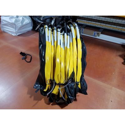 Stand with one person behind and one person in front of the barrier. The person in front of the barrier picks up the front flap and places it on the tunnel. The person behind the barrier grabs the rubber elastic attached to the storm flap and hooks it into the sail ring of the front flap. Repeat this with the remaining elastics. Fold the barrier together so that a small package is created. Place the storage box next to the package.