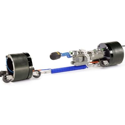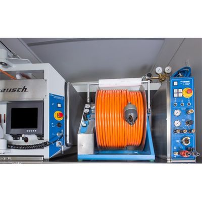Pressure test system for single joint tests from 200 - 600 mm (Patent No.DE19740276). The tests can be carried out either by air or water; the test sleeves are separately filled. Packer pressure, variable 1,5 - 4,5 bar; test pressure selectable up to 500 mbar. This pressure test system consists of the control unit Premus 600, supplemented by the respective Kampac test packer according to the pipe diameters. A pan and tilt camera is integrated inside the packer. Between the two packer sleeves, is a Plexiglas which allows the camera a 360°view of the pipe for accurate positioning and optical control of the joint during the tests.
