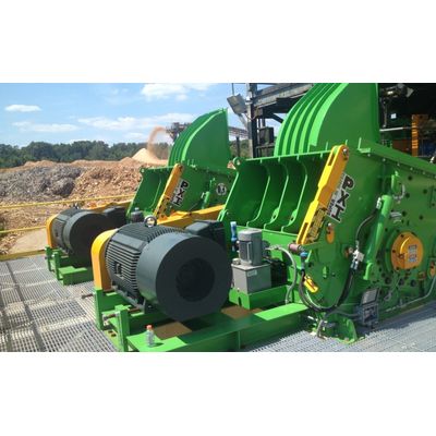 Rawlings 460 Horizontal Feed Hog processing wood waste with twin 300 Horsepower motors for a industrial Mulch bagging operation. This system is complete with a receiving conveyor, belt in-feed and vibratory out-feed conveyor, metal detector, work platform and Rawlings Horizontal grinder. Each unit is equipped with the Rawlings Super Hi-Inertia™ Solid Steel Rotor. With the increased inertia of the solid steel rotor our machine runs at lower RPM’S than our competitors resulting in overall savings of electricity and maintenance costs.