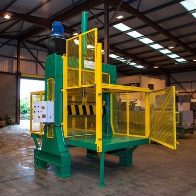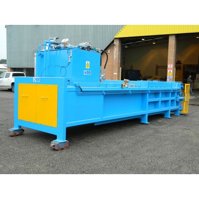 Horizontal, automatically operating channel baling press. 100 tonnes pressing force. Bigro 1027 Product information: H x W x L (mm): 4500 x 2100 x 11800, Hopper (mm) (L x W): 1300-2000 x 1060, Weight: 24 tonnes, Compaction force: 100 tonnes, Vertical tying wires: 4.