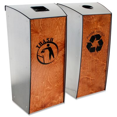 The Evolution-80™ is an elegant recycling and trash bin combination constructed of brushed aluminum and steel, with a birch wood dark mahogany finished front. These bins are connected at the rear. The Evo-80™ makes an elegant statement and provides a sleek and stylish high-end total solution for convenient collection of recyclables and trash.