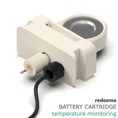 This cartridge incorporates ability to measure temperature near the electrode stack to the features of the Three Electrode Battery Test Cell. It is ideal choice when researcher wants to monitor temperature while performing reproducible electrochemical measurements of battery and supercapacitor materials under controlled compression. The installed temperature sensor is standard Pt100 resistance temperature detector (RTD). It ensures accurate and reliable readings in -50°C → +250°C range. It has a robust construction with the sensing element encased in a rigid 316 stainless steel sheath. The leads have a durable and flexible Teflon insulation and are screened for protection against electromagnetic interference. Leads connect to any 2, 3 or 4 wire Pt100 temperature measuring equipment.The temperature probe is located next to the reference electrode and is in direct contact with electrolyte, ensuring precise and real temperature reading from inside the cell