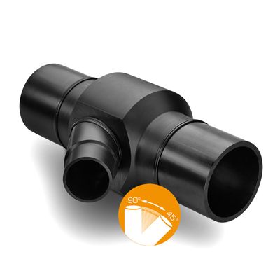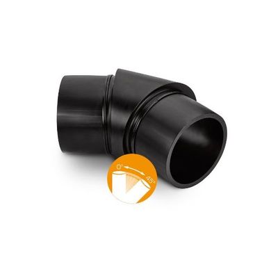45° elbows made of pipes and semi-finished materials. The main body of the elbows is manufactured from homogeneous hollow bar with flow optimisation with an exceptionally space-saving design and extended piping, which means that processing with electrofusion sockets and heated element butt welding is also possible. The compact dimensions enable direction changes in the smallest possible space. The mechanical production guarantees precise and consistent angular accuracy, simplifying installation and minimising the work required. Additional elbows available upon request.