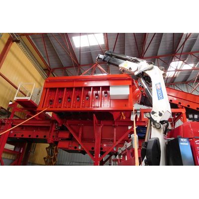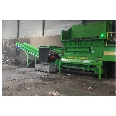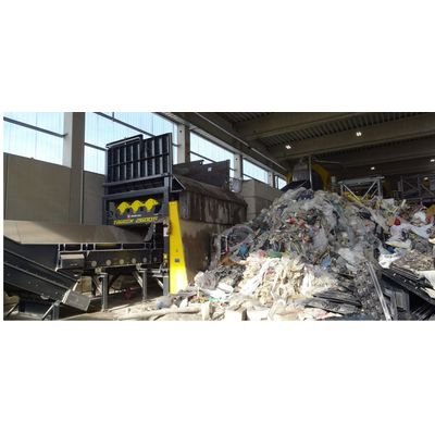Stationary, slow speed, mono-rotor shredder with electric power pack (90 kW - 132 kW - 160 kW). One hydraulically driven rotor, with a diameter of 1 meter, shreds the input material in both directions of rotation on two bolted side combs. The side combs can be different on the left and right side to achieve a coarser or finer end product according to the preferred rotating direction. The operator can determine the rotating speed, direction and time per rotating direction according to the specific application via the control display. In case of overload, the rotor switches to the other rotation for an adjustable time. This shredder is particularly suitable for the shredding of household waste and biodegradable waste streams. The RAPTOR is a stationary, slow speed, monorotor shredder with hydraulic drive.