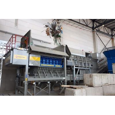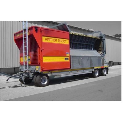 Mobile, slow speed, mono-rotor shredder on trailer chassis, with integrated diesel engine power pack. One hydraulically driven rotor, with a diameter of 1 meter, shreds the input material in both directions of rotation on two bolted side combs. The side combs can be different on the left and right side to achieve a coarser or finer end product according to the preferred rotating direction. The operator can determine the rotating speed, direction and time per rotating direction according to the specific application via the control display. In case of overload, the rotor switches to the other rotation for an adjustable time. This shredder is particularly suitable for the shredding of household waste and biodegradable waste streams. The RAPTOR is a stationary, slow speed, monorotor shredder with hydraulic drive.