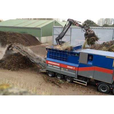 Mobile, slow speed, double-rotor shredder on a semi-trailer chassis, with integrated diesel engine power pack. This model has shorter rotors and less power. The two hydraulic driven rotors are independently programmable and shred the input material through a central knife and two lateral knives. The different types of central and lateral knives that can be used, together with the unlimited adjustment possibilities of the PLC, turn the DINOSAURUS into the most flexible shredder available on the market. This enables us to adapt each shredder to the specific requirements of our customers and to the required product specifications for their production processes.