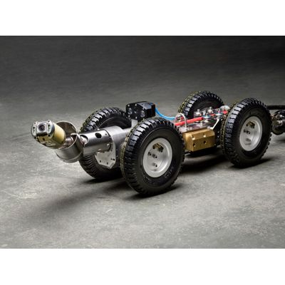 The FW150SAT.1 is a satellite carriage with a feed unit for a push cable for inspection of branches. The extremely robust trolley can be used in the main channel from a diameter of 150 mm and in the lateral pipe from Ø 100 mm. It is powered by 4 wheels that can be changed easily and without tools thanks to the quick-release fastener. The company RICO offers two solutions for lateral pipe inspection: firstly the long-distance oparation up to 500 m in the main pipe and the short-range application up to 150 m via stationary push rod cable reel. Optionally, the trolley FW150SAT.1 can be equipped with feed by high pressure jetting.