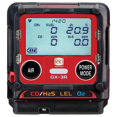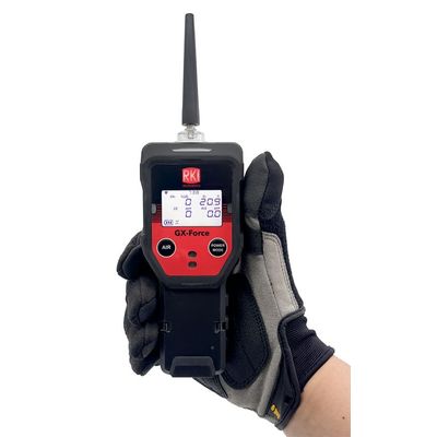 The GX-Force by RKI Instruments is an advanced, compact 1-4 gas monitor designed for both personal and professional use, ideal for confined spaces and safety monitoring. It features a robust internal sample pump capable of a 100-foot sampling range and weighs only 9.8 ounces. It supports monitoring of standard confined space gases, including combustible gases (LEL), oxygen (O2), carbon monoxide (CO), and hydrogen sulfide (H2S). Equipped with advanced micro-sensors compatible with other RKI instruments like the GX-3R and Gaswatch 3, it offers two operational modes: Normal Operating mode for routine safety assessments and Leak Check mode for precise leak investigations of combustibles in ppm range. The GX-Force operates for up to 30 hours on a Li-ion battery, showcasing readings on a large LCD display. Critical alarms, both visual and audible, are programmable, ensuring immediate alerting in case of sensor errors or hazardous conditions. These alarms can either lock the device or halt further readings if calibration is overdue.RKI - Confined Space 4 Gas Monitor