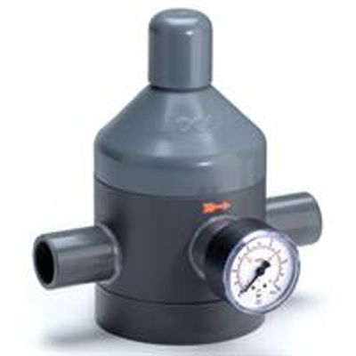 Our pressure control valves from PVC, PP or PVDF (further materials available upon request) reduce system pressure to a defined value. They are available with widths of DN10–DN100. Using differential pressure, the pressure reducer adjusts itself to the set operating pressure. There is no direct relation between the outlet and inlet pressure. The output point acts on the membrane surface via a control bore, pushing against the set spring force. When an equilibrium of forces has been reached, the valve closes and maintains a constant operating pressure. If the pressure on the output side falls, this means that the set spring force is greater. The valve opens to restore the equilibrium.
