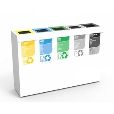 Five-compartment recycling unit. It is made of 304 quality stainless steel or electrostatic painted 430 quality stainless steel. It has an inner bucket and it is discharged from the top. Optionally, the inner bucket can be used with or without plastic bags. It has two option which is swing top lid and without the lid. It has also a hidden wheel system.